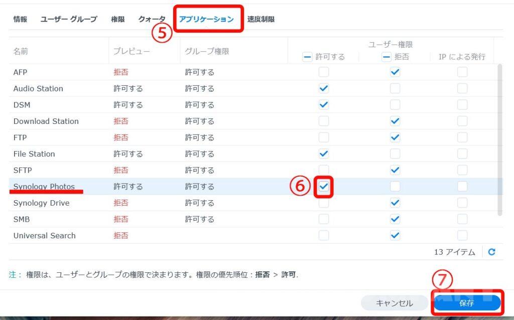 ⑥synology photos のユーザー権限「許可する」のボックスにチェックを入れる