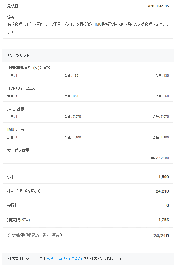 無念ですが最初のDJIの修理価格で仕方なく修理を依頼。