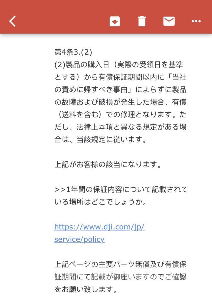 修理窓口に連絡するとすぐに返信があり、DJIにて点検・確認を行うため発送方法の案内がありました。