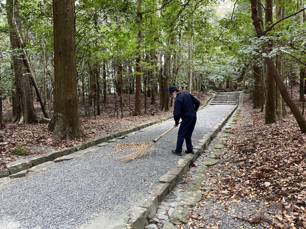 伊勢神宮では、落ち葉などは捨てたり焼却したりせず、自然へと返すそうです。砂利の上の落ち葉だけを掃ける先のばらばらになった竹ぼうきを使用しているそうです。